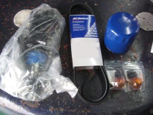 左からアイドラアームブラケット、ファンベルト、オイルエレメント、ウィンカーバルブになります。