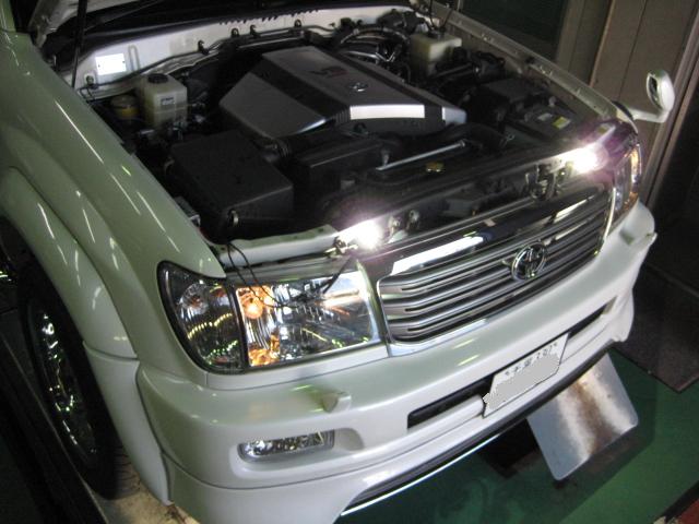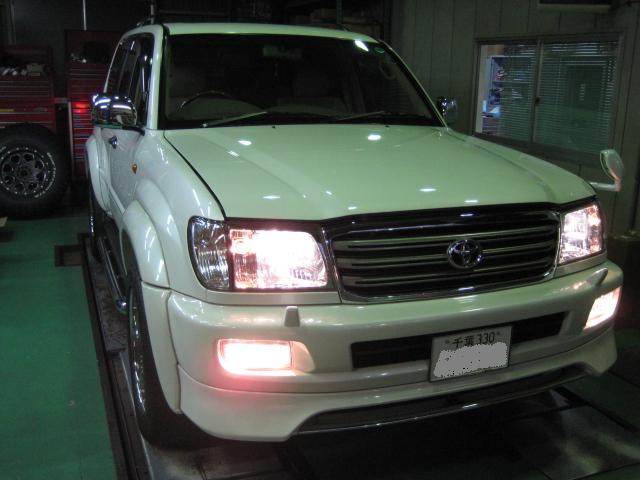 千葉県 銚子市 ランクル100 LOUDHID HB4 6000K取付・20インチ 4輪アライメント調整。。。