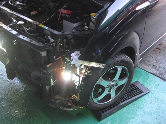 スペース確保のためまずバンパーを外して、ヘッドライトを外して行きます。。。